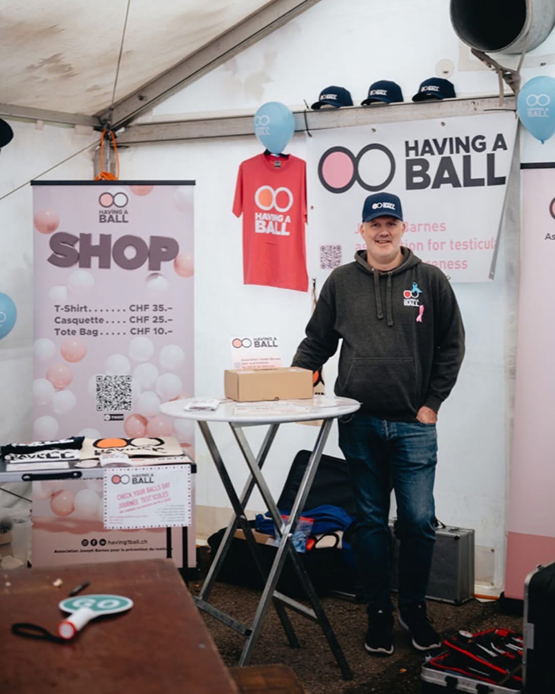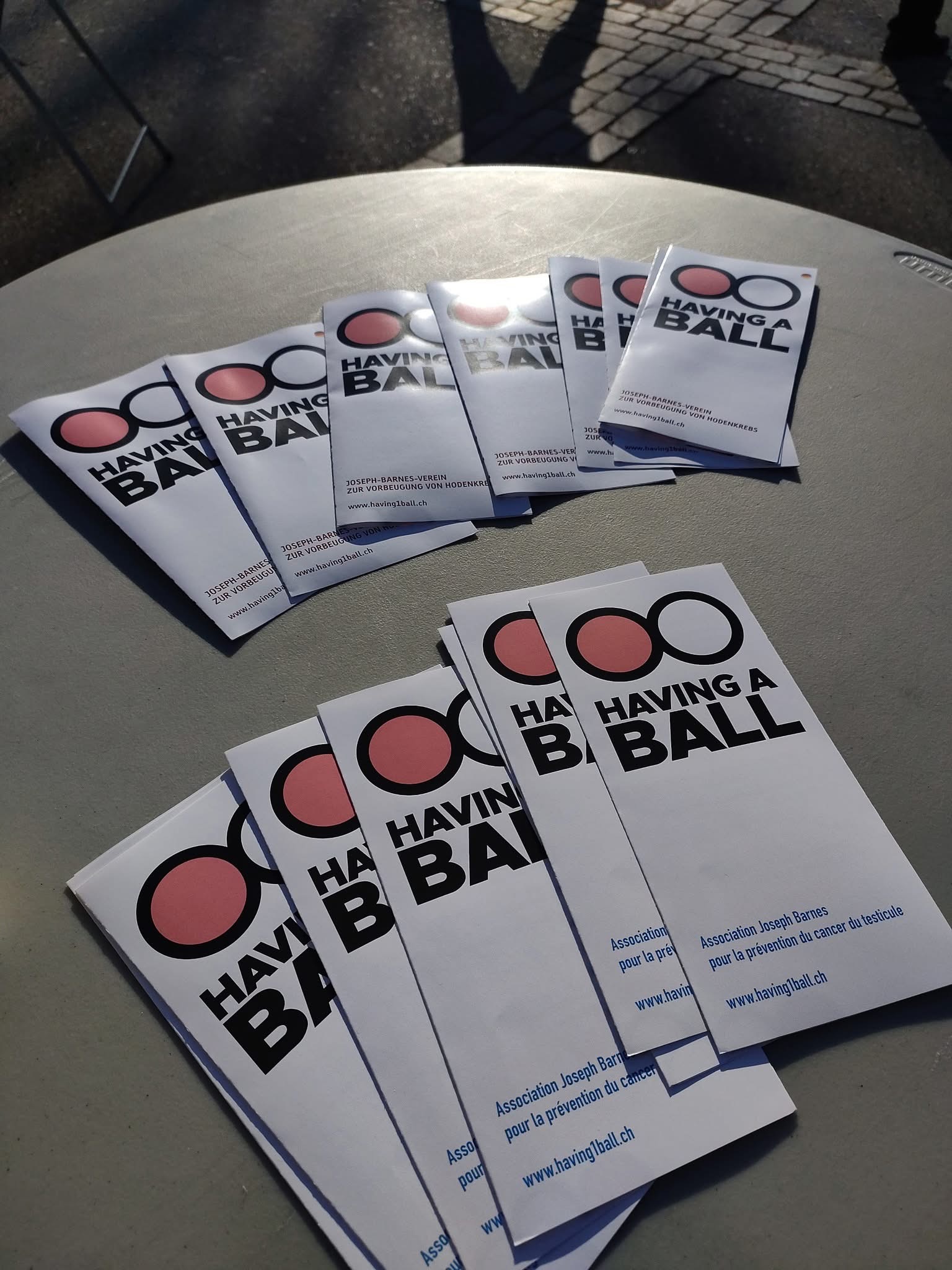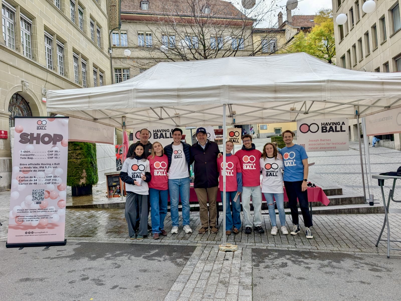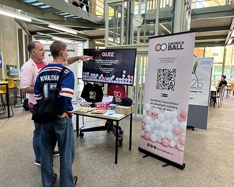 Journée «Test’icules» Check Your Balls Day. Having a Ball est en pleine croissance ! Cette année, nous étions présents dans 6 villes suisses avec nos tentes de dépistage. Au total, 11 urologues et 2 oncologues ont généreusement offert de leur temps pour des dépistages gratuits. Plus de 400 hommes se sont rendus à nos stands installés dans des lieux centraux. Leurs engagements, ainsi que la confiance et l’ouverture de celles et ceux qui sont venus se faire examiner, ont fait de cette campagne l’une de nos plus marquantes à ce jour.