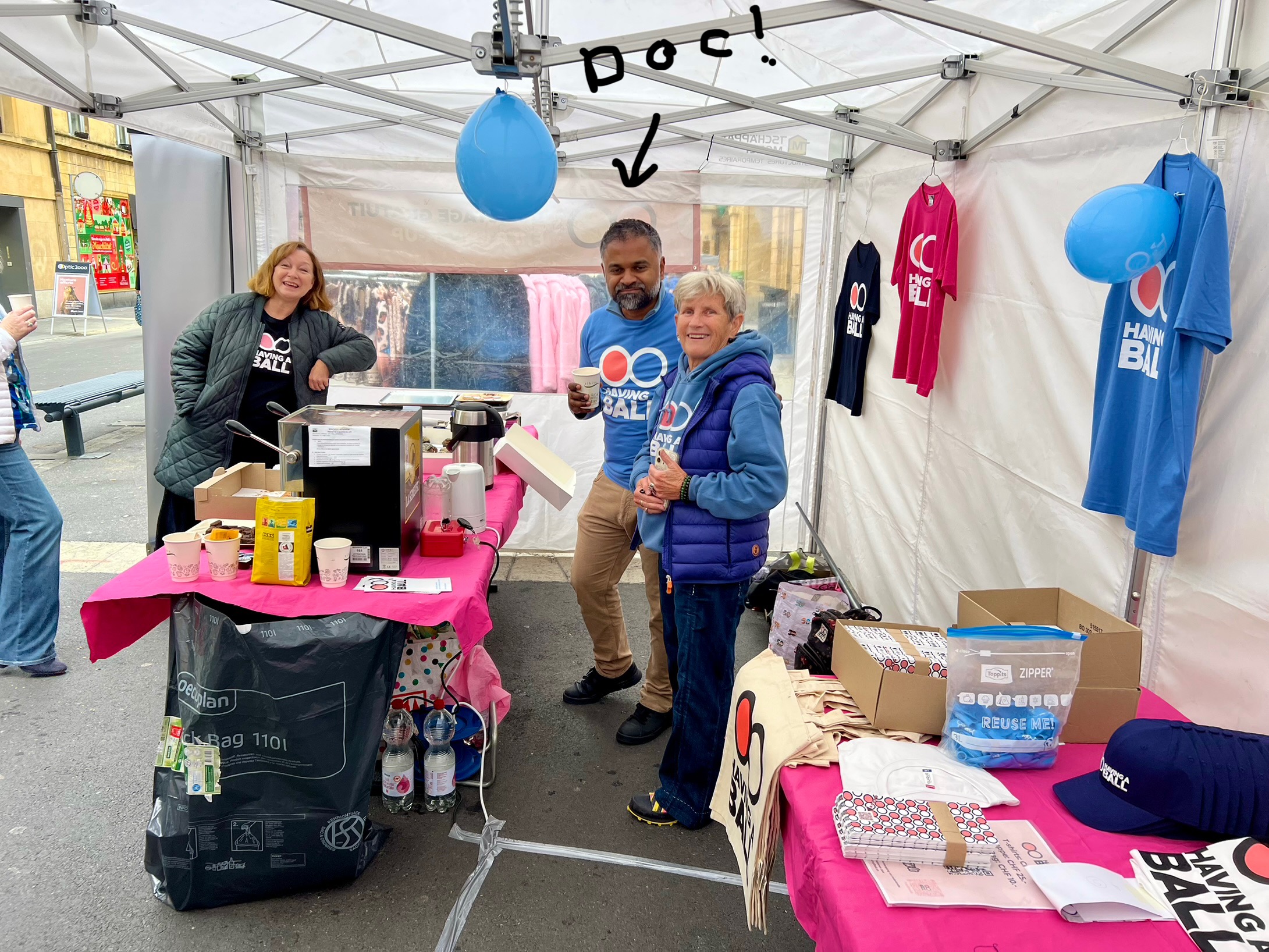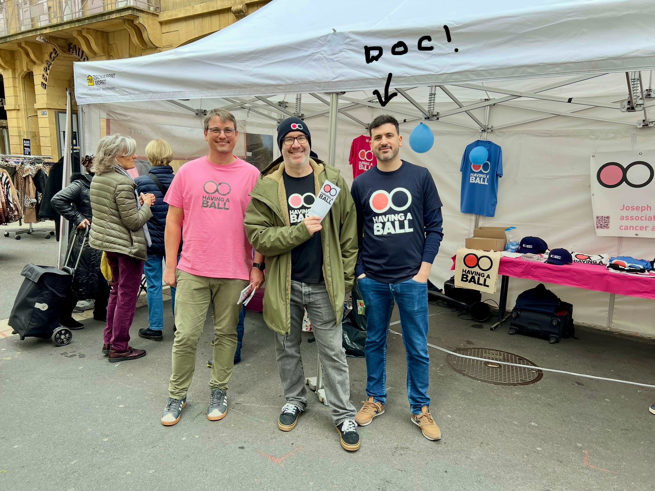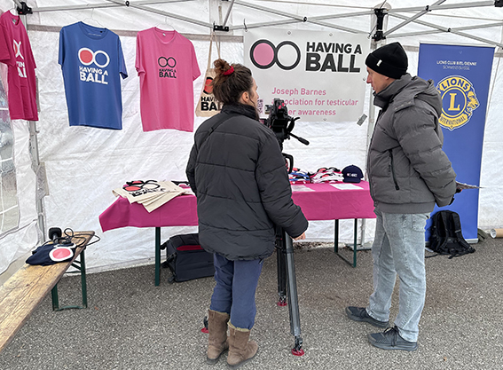 Journée «Test’icules» Check Your Balls Day. Having a Ball est en pleine croissance ! Cette année, nous étions présents dans 6 villes suisses avec nos tentes de dépistage. Au total, 11 urologues et 2 oncologues ont généreusement offert de leur temps pour des dépistages gratuits. Plus de 400 hommes se sont rendus à nos stands installés dans des lieux centraux. Leurs engagements, ainsi que la confiance et l’ouverture de celles et ceux qui sont venus se faire examiner, ont fait de cette campagne l’une de nos plus marquantes à ce jour.